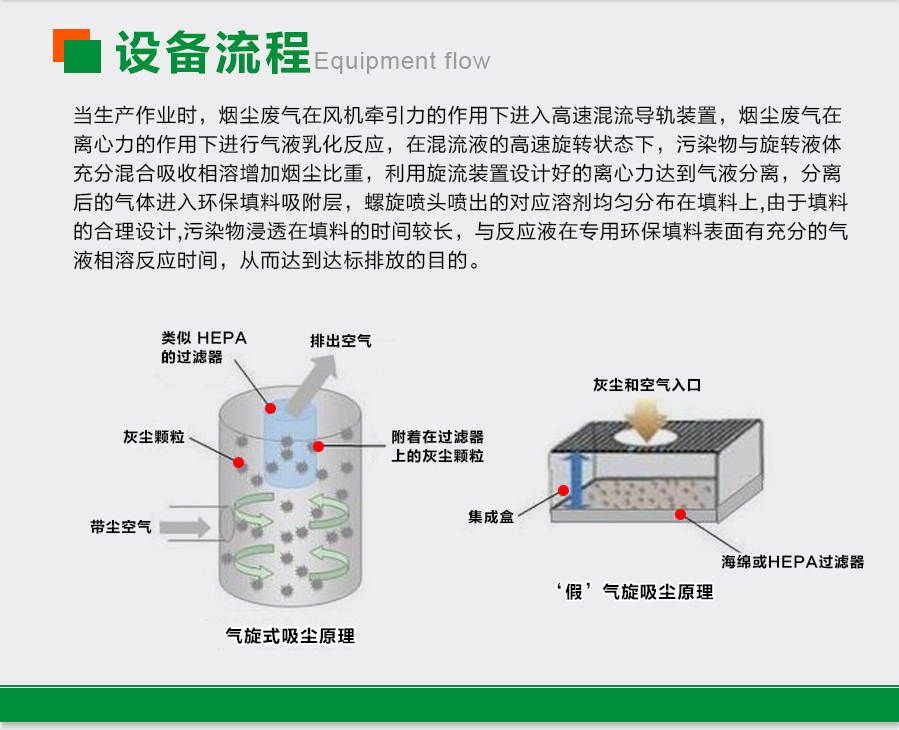 含塵含味氣體通過吸氣罩收集,在風機的作用下,經過管道輸送負壓進入雙級氣旋噴淋塔。氣旋混流裝置快速運轉,多級連續的凈化使得含塵含味氣體與水霧充份混合,在離心的作用下達到氣液分離。氣旋桶內部采用水泵循環給水,水在水箱經水泵增壓后自螺旋噴嘴霧化而出,最后回流至水箱循環使用。分離出來的雜物下沉到水箱底部,經凈化后的氣體進入填料隔水層,然后由風機排出。