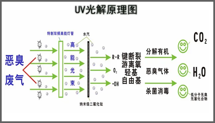 2、利用特制的高能UV紫外線光束照射惡臭氣體,裂解惡臭氣體的分子鍵,降解轉變為低分子化學物,如二氧化碳和水等物質。