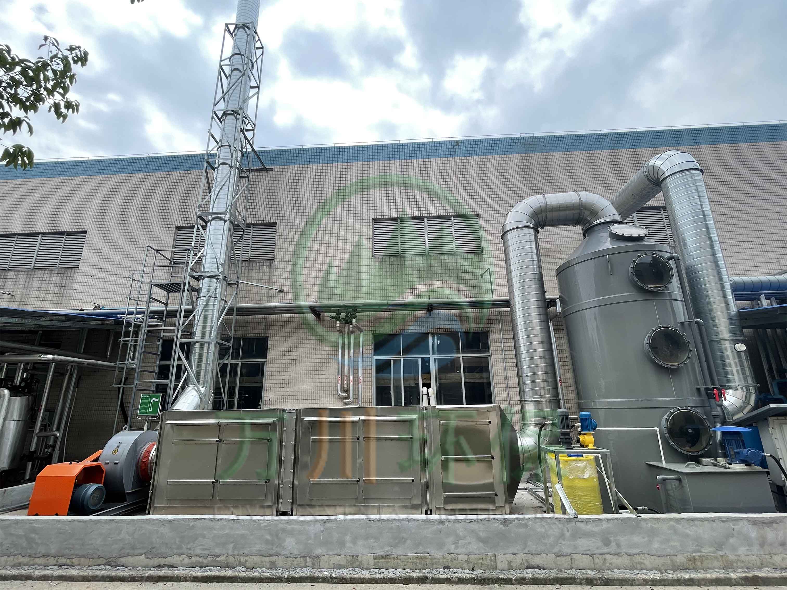根據廢氣類型和場地需求我們采用噴淋塔+兩級活性炭對其進行處理。反應釜廢氣處理配套一臺17170風量pp噴淋塔+兩臺17170風量的不銹鋼材質活性炭吸附塔+干式過濾與大功率防爆離心風機+自動化電控柜系統。